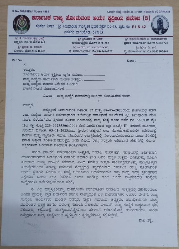 In the context of the reservation struggle under the leadership of Hubballi Somavamsa Arya Kshatriya Samaj in 1987, the elders and leaders of the society realized the need and need of a state level organization for the overall development of our society and the Karnataka State Somavamsa Arya Kshatriya Samaj was established in December 1988 under the leadership of Hubli Samaj.